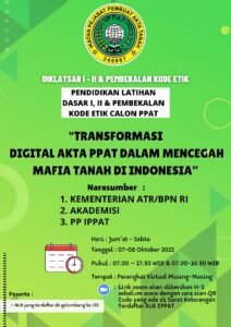 Diklatsar dan Pembekalan Kode Etik dengan tema “Transformasi Digital Akta PPAT dalam Mencegah Mafia Tanah di Indonesia” tersebut menghadirkan narasumber kompeten dari Pengurus Pusat Ikatan Pejabat Pembuat Akta Tanah (IPPAT), Kementerian ATR/BPN, dan para akademisi. (Humas PP IPPAT)