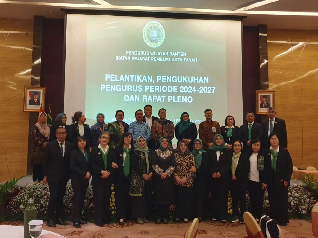 BANTEN – Ketua Umum Pengurus Pusat Ikatan Pejabat Pembuat Akta Tanah (PP IPPAT) Dr. Hapendi Harahap, S.H.,Sp.N.,M.H., lantik dan kukuhkan Pengurus Wilayah Ikatan Pejabat Pembuat Akta Tanah Banten untuk masa bhakti 2024-2027.