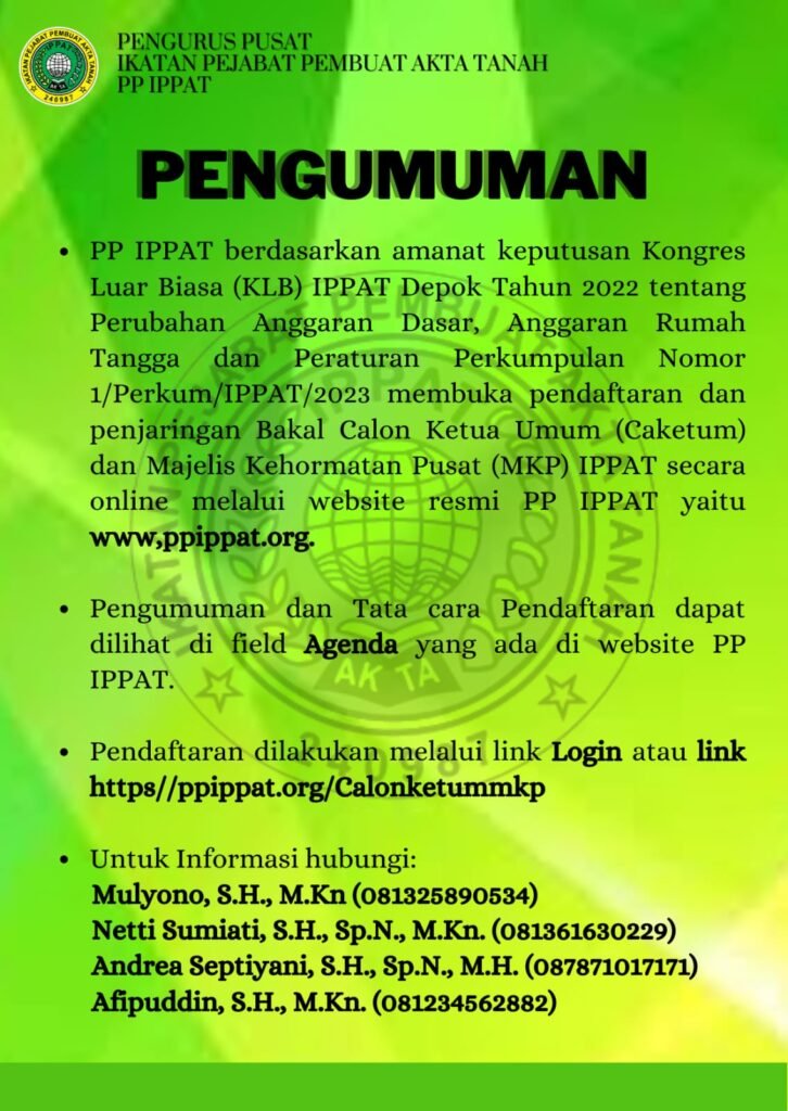 PP IPPAT menghimbau agar anggota IPPAT yang ingin mendaftar sebagai Bacaketum Formatur IPPAT dan Anggota MKP memanfaatkan sisa waktu untuk segera mendaftar melalui website yang tersedia yaitu ppippat.org.