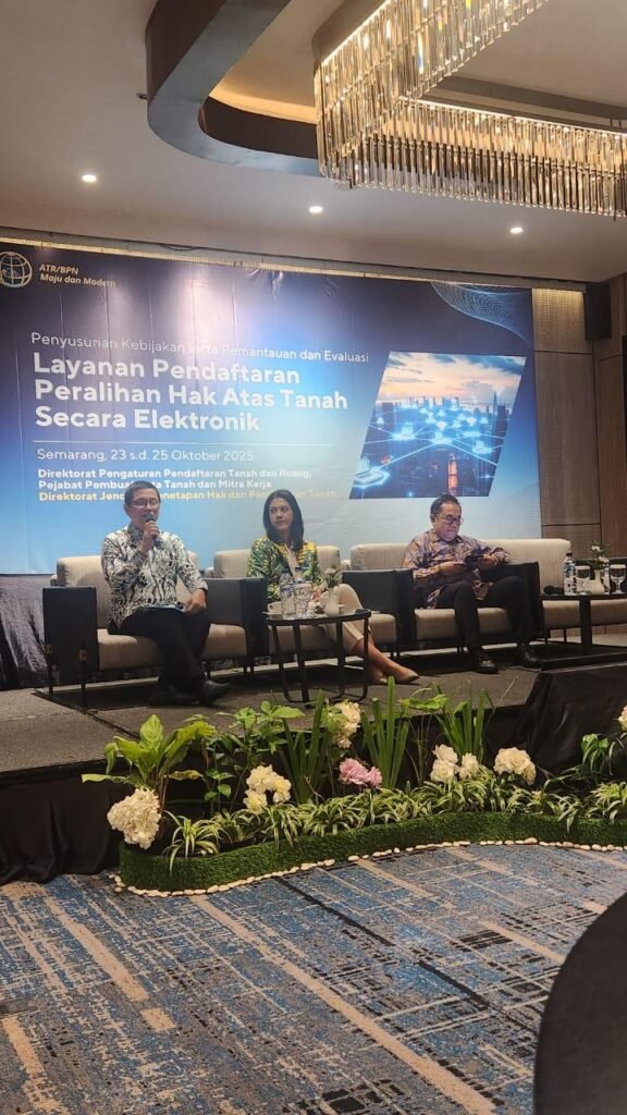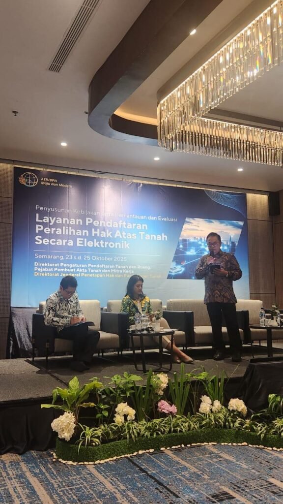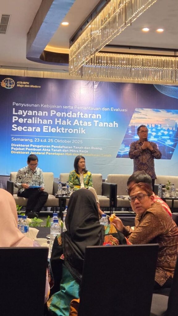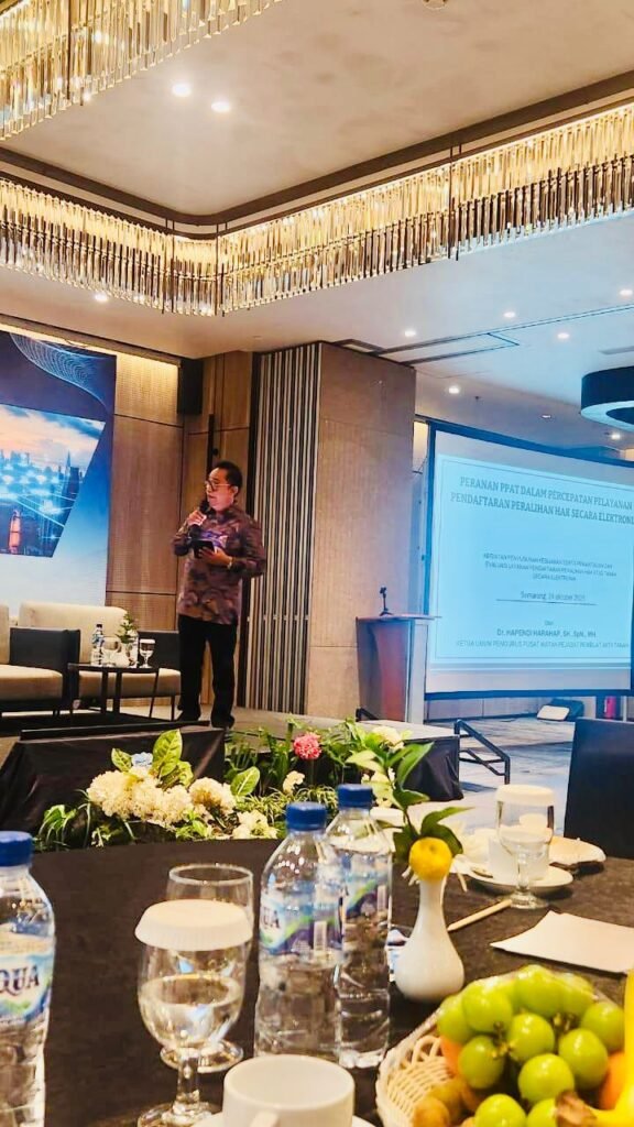 SEMARANG – Ketua Umum Pengurus Pusat Ikatan Pejabat Pembuat Akta Tanah (PP IPPAT), Dr. Hapendi Harahap, SH., SpN., MH., menegaskan peranan krusial Pejabat Pembuat Akta Tanah (PPAT) dalam percepatan pelayanan pendaftaran peralihan hak secara elektronik, hal tersebut disampaikannya selaku narasumber pada acara Kegiatan Penyusunan Kebijakan Serta Pemantauan dan Evaluasi Layanan Pendaftaran Peralihan Hak Atas Tanah Secara Elektronik, yang dilaksanakan Kamis – Sabtu, tanggal 23-25 Oktober 2025 lalu di Hotel Arus Semarang Jalan Dr. Wahidin Nomor 166 Jatingaleh Semarang.
