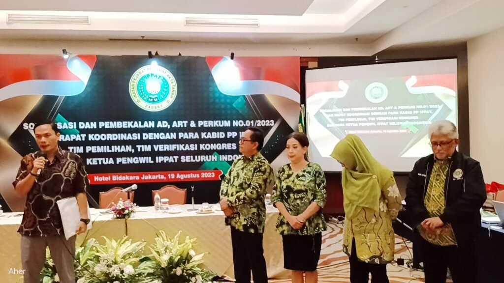 Jakarta, Ppippat.org, PP IPPAT menggelar Sosialisasi dan Pembekalan AD ART dan Perkum No 1/2023, sekaligus rapat koordinasi dengan para Kabid PP IPPAT, Tim Verifikasi, Tim Pemilihan Kongres IPPAT VIII , dan para Ketua Wilayah IPPAT seluruh Indonesia, di Hotel Bidakara, Jakarta Selatan, Sabtu 19 Agustus 2023