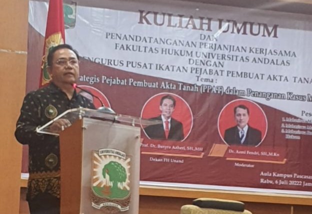Sebelum dilaksanakan penandatangan nota kesepahaman Ketua Umum IPPAT Hapendi Harahap memberikan kuliah umum dengan tema “Peran Strategis Pejabat Pembuat Akta Tanah (PPAT) dalam Penanganan Kasus Mafia Tanah”. (Humas PP IPPAT)