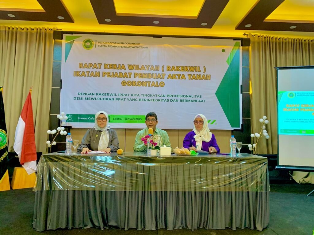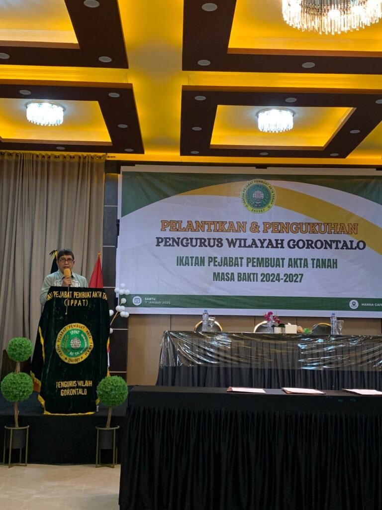 GORONTALO – Pengurus Wilayah Ikatan Pejabat Pembuat Akta Tanah(Pengwil IPPAT) Gorontalo periode tahun 2024 – 2027 resmi di lantik dan dikukuhkan oleh Ketua Pengwil IPPAT Gorontalo Dr. Kaharuddin Kamaru, S.H.,M.Kn. selaku kuasa dari Pengurus Pusat Ikatan Pejabat Pembuat Akta Tanah (PP IPPAT).