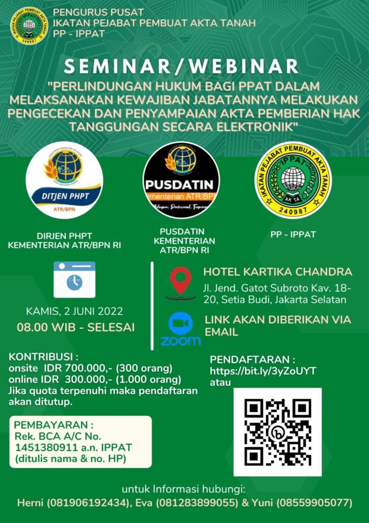 Jakarta, PP IPPAT akan mengadakan Seminar Nasional dengan tema “Perlindungan Hukum Bagi PPAT dalam Melaksanakan Kewajiban Jabatannya Melakukan Pengecekan Sertipikat dan Penyampaian Akta Pemberian Hak Tanggungan Secara Elektronik”. Seminar diselenggarakan secara onsite dan online pada tanggal 2 Juni 2022, dengan menghadirkan narasumber berkompeten dari Kementerian Agraria Tata Ruang/Badan Pertanahan Nasional (ATR/BPN) Republik Indenesia dan Pengurus Pusat Ikatan Pejabat Pembuat Akta Tanah (PP IPPAT).