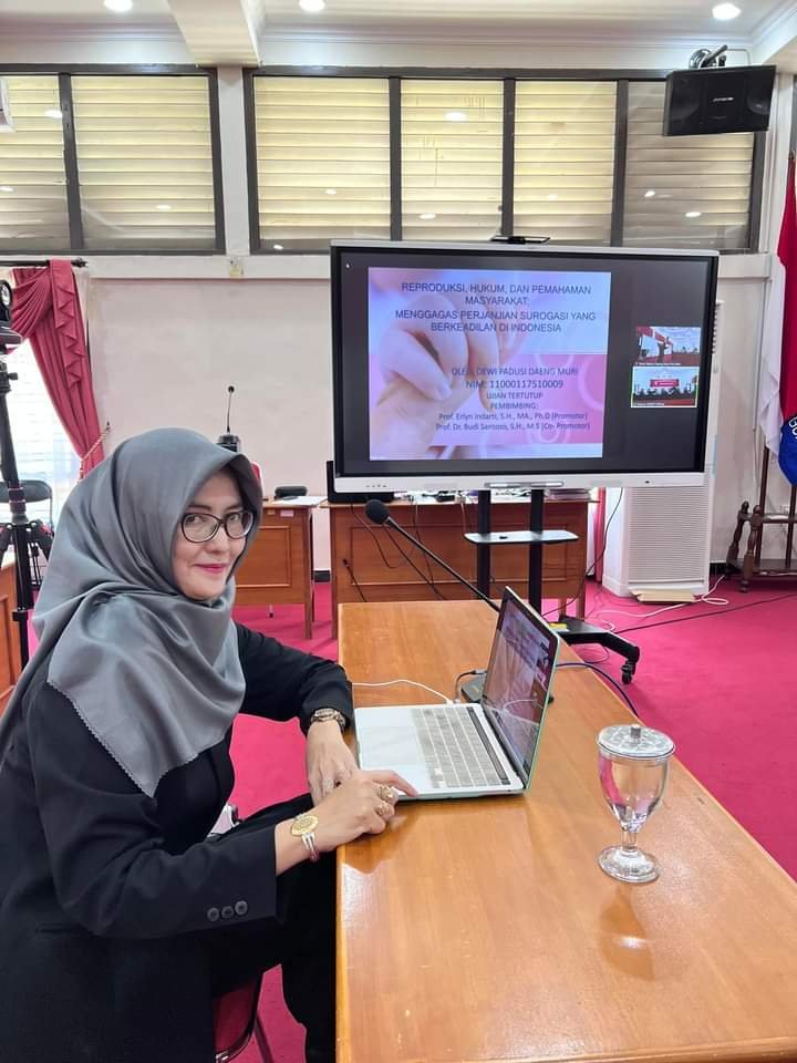 Promovenda Dewi Padusi Daeng Muri mempertahankan disertasinya dengan judul “Reproduksi, Hukum dan Pemahaman Masyarakat : Menggagas Perjanjian Surogasi Yang Berkeadilan di Indonesia”, dan dinyatakan lulus dengan nilai sangat memuaskan, dengan Indeks Prestasi Kumulatif 3,8.
